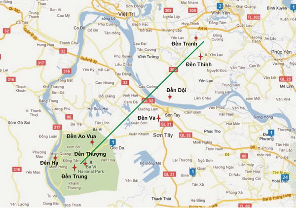 Lĩnh Nam chích quái cho biết Sơn Tinh đã “làm một con đường thẳng như sợi dây từ Bạch Phiên Tân lên thẳng phía Nam núi Tản Viên tới động An Uyên”. Có thể thấy con đường này chính là từ bến thuyền trên sông Hồng cạnh Sơn Tây (nay là phà Mông Phụ – Vĩnh Thịnh), chạy thẳng lên đền Thượng theo hướng Đông Bắc – Tây Nam (hướng Cấn – Khôn).