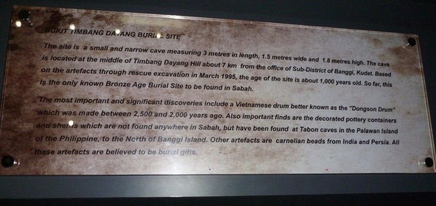 Khảo cổ khu vực Sabah thời kỳ trước Công nguyên không có gì ngoài đúng 1 ngôi mộ cổ trong đó lại có một chiếc trống đồng Đông Sơn được chôn cùng. Chiếc trống đồng “Việt Nam” này có niên đại khoảng 2.000 – 2.500 trước, tức là thời Hùng Vương ở nước ta. Ở khu vực này không có những hiện vật đồ đồng khác của nền văn hóa đồ đồng bản địa nên chiếc trống đồng này chỉ có thể là mang từ nơi khác đến đây. Chiếc trống đồng Việt Nam ở Sabah này là một bằng chứng rõ ràng, người Việt đã có mặt ở khu vực này từ thời trước Công nguyên.