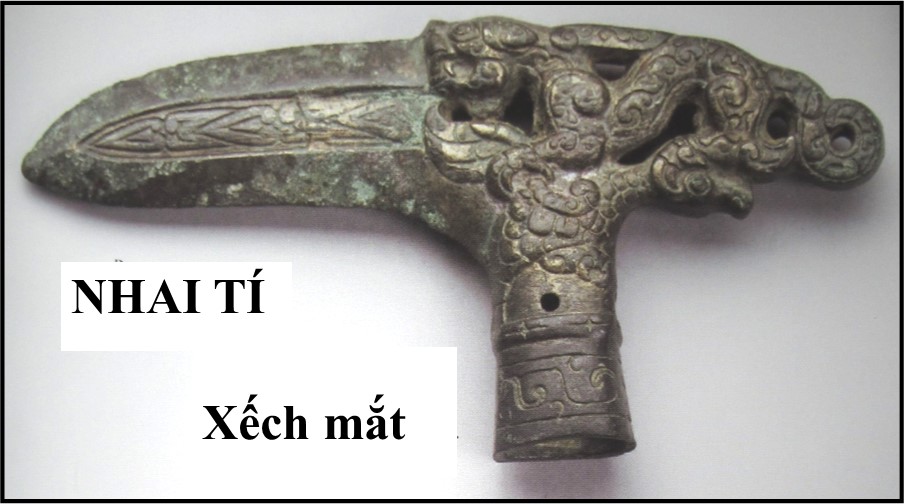 Hình rồng trên cán vũ khí đã xuất hiện từ thời Chiến Quốc trong cả đồ đồng Thương Chu cũng như đồ Đông Sơn. Ban đầu là cả một cụm rồng nối nhau như trên chuôi kiếm. Cũng có những chiếc qua đồng của thời này với phần chuôi là hình cả con rồng. Như vậy hình tượng Nhai tí cũng có nguồn gốc là trang trí rồng trên vũ khí đồng từ thời Chiến Quốc.
