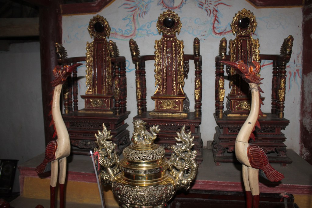 Chồng kiệu 7 vị rồng và hoàng hậu Minh Đức trên sân đình Nhật Tân.