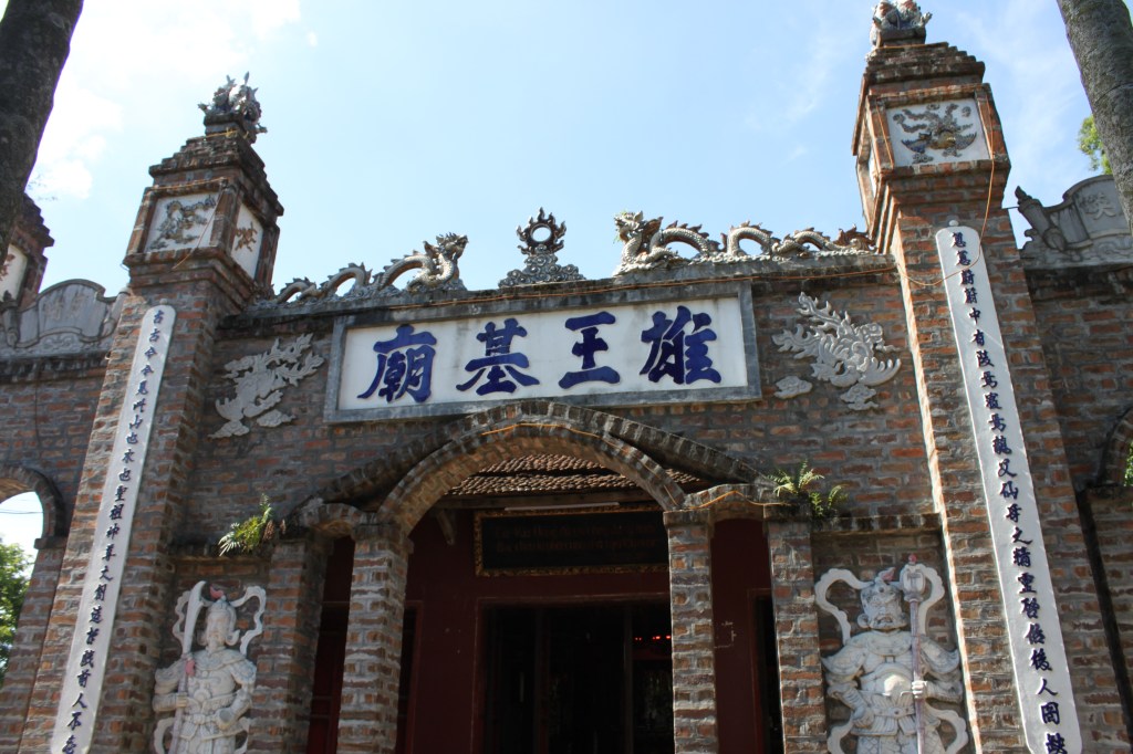 Câu đối ở nghi môn đền An Dương Vương ở Cổ Loa: Chiêu lăng tùng bách kim hà xứ Thục quốc sơn hà tự cố cung.