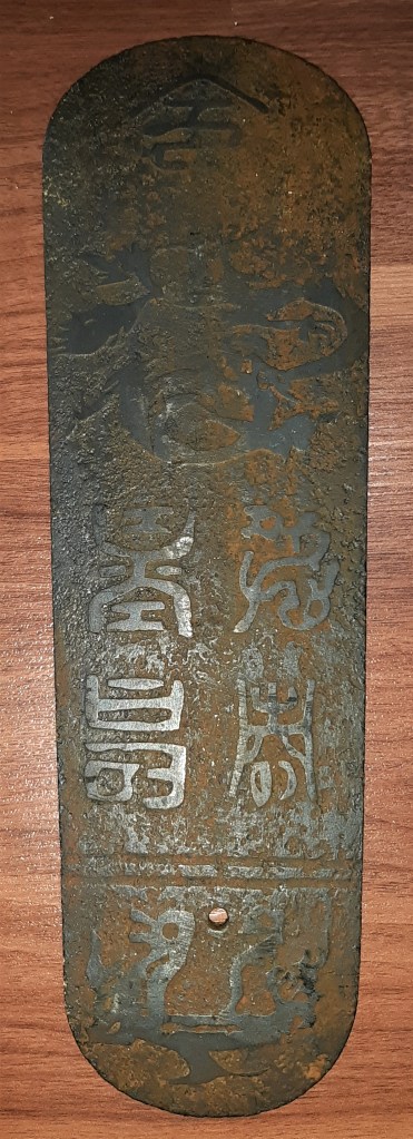 Tấm thẻ lệnh có chữ Tín lễ Tần Vương chi chủ và mặt sau có 3 dòng chữ: