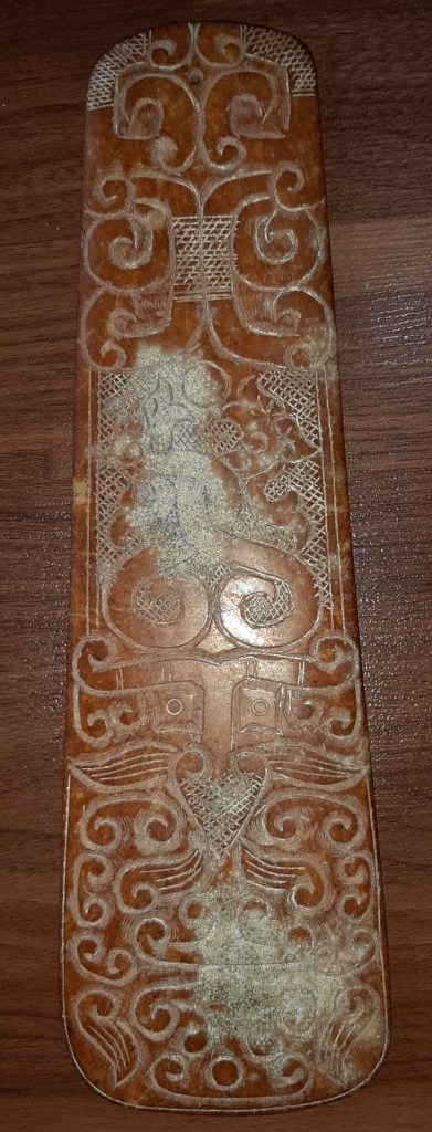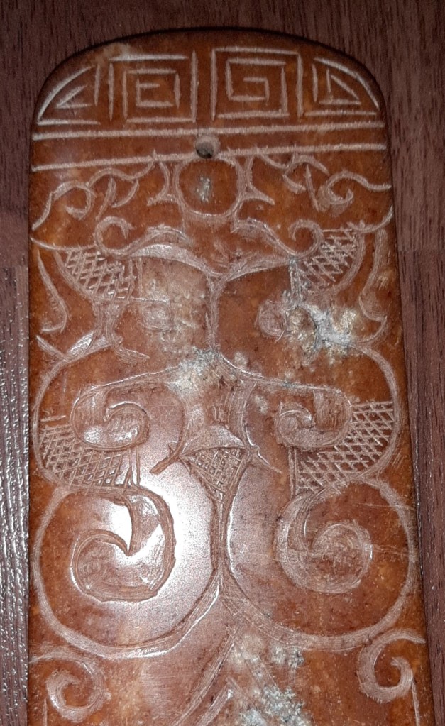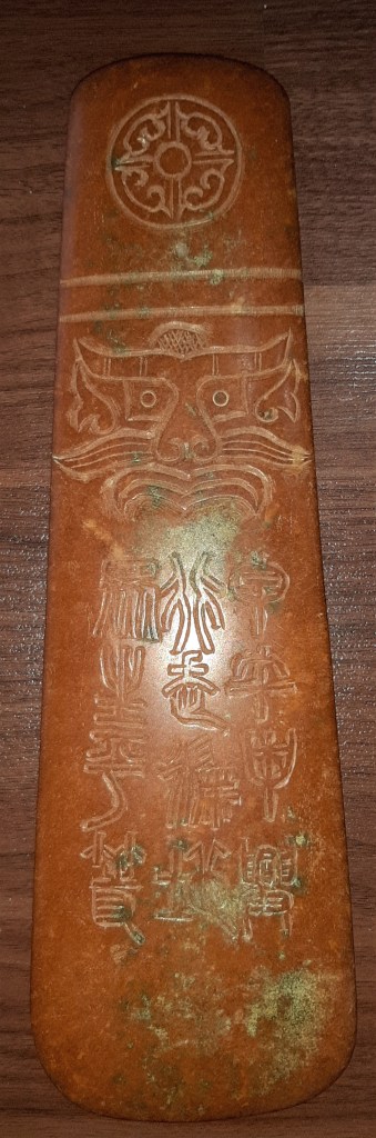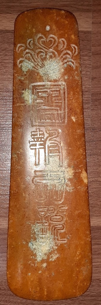 Mặt sau của thanh ngọc giản được trang trí bằng một hình tròn biểu tượng của Ngũ hành và một mặt hổ phù. Bên dưới có 3 dòng chữ tiểu triện là: