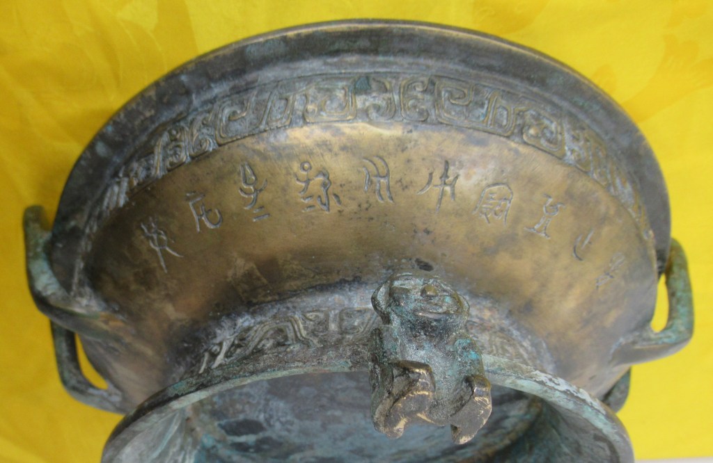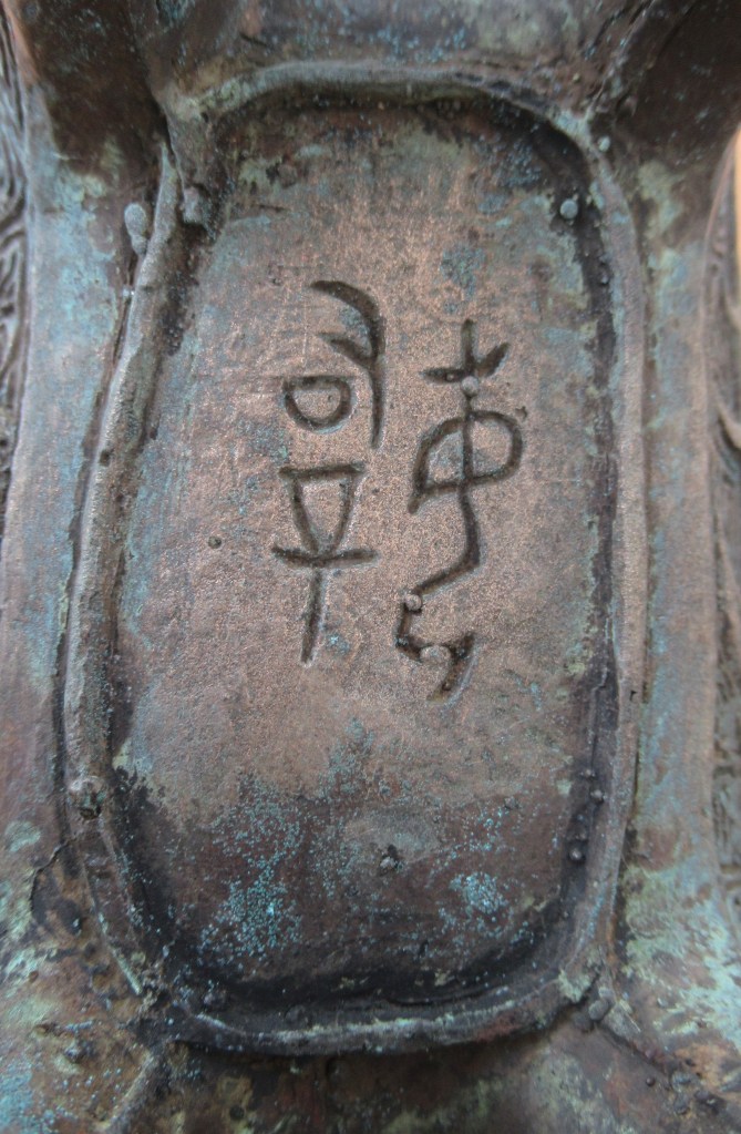 Bên dưới chiếc “dương quang” này có dòng chữ đúc chìm, mà thường được đọc là Tư Mẫu Tân 司母辛 và được giải nghĩa là “Dành tế Mẫu Tân”. Cách đọc này tương tự như trên chiếc đỉnh lớn nhất thời Thương đã được phát hiện, với chữ Tư Mẫu Mậu 司母戊. Trong đó chữ cuối cùng là tên một trong thập can, là cách dùng thời Ân Thương để gọi các vị vua (như các tên của Vũ Đinh, Đế Tân).