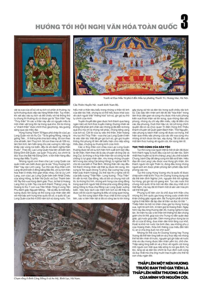 Khơi nguồn tinh hoa văn hóa Việt, tức là khơi dậy những giá trị đẹp và lành của tiền nhân đã ngàn đời tạo dựng. Lịch sử Việt đặc biệt ở chỗ, chúng ta có riêng một dòng sử dân gian qua các truyền thuyết, tích cổ, qua những thần tích, ngọc phả còn lại. Cổ sử, từ cái cốt lịch sử trở thành những trang huyền sử. Thế nên, hiếu đạo không dừng lại ở việc thờ cúng tổ tiên, mà còn thể hiện thế giới quan và nhân sinh quan của dân tộc Việt. Thờ Thần là một đặc trưng trong tín ngưỡng thờ cúng tổ tiên của người Việt, trong đó có thờ thành hoàng, thờ tổ nghề và có hệ thống nhất là thần điện của đạo Giáo Tam phủ và đạo Mẫu Tứ phủ.