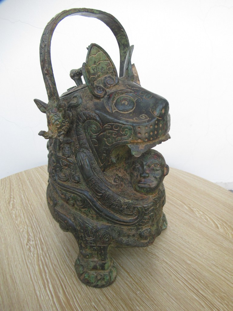 4. Một hình tượng Hổ đặc biệt gặp trên một bảo vật có niên đại từ thời Ân Thương (cách nay trên 3.000 năm) là chiếc bình Hổ tôn. Chiếc bình có hình Hổ đang ở tư thế ngồi. Đầu Hổ to, có 2 tai nhọn, mắt và mũi Hổ lớn, trông rất có thần thái. Miệng Hổ há rộng, lộ hàm răng trên. Hai chân trước của Hổ quặp lấy một hình người đúc nổi. Đầu người trần trụi nằm ngay dưới miệng Hổ. Hai tay người dang ra, ôm lấy thân Hổ. Hai chân người ngồi choãi ra hai bên, với bàn chân trần dẫm lên 2 chân Hổ. Nắp bình khá nhỏ, có tay cầm đúc ở dạng hình một con Hươu có chấm như Hươu sao và được trang trí bằng 2 con Quỳ Long ở 2 bên. Mặt trong của nắp bình có đúc chìm tộc huy hình chim (Điểu) và 2 chữ “Phụ Quý”, là tên của một vị vua nhà Ân Thương. Quai bình có 2 đầu hình một loài vật mặt như mặt Cáo, có 2 răng nanh và mõm dài nhô ra như đầu loài Cầy vòi. Trên tay cầm của bình có hình các con Quỳ Long. Phần lưng bình có mặt Thao thiết có sừng, gắn với phần đuôi tròn, dày và cong cuộn. Đuôi Hổ cùng với 2 chân trước làm thành chỗ tựa thứ ba cho chiếc bình.