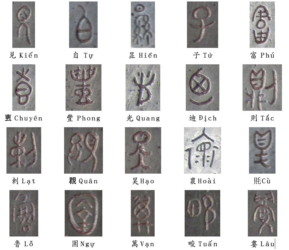 Ví dụ chữ “Kiến” trong chữ thời Tây Chu được vẽ nhấn mạnh con mắt của con người đang đứng trên 2 chân. Hình con mắt được vẽ to lên, trong khi 2 vạch thể hiện đôi chân lại dài và uốn lượn. Nhìn cả chữ không khác gì con nòng nọc có đuôi dài.
