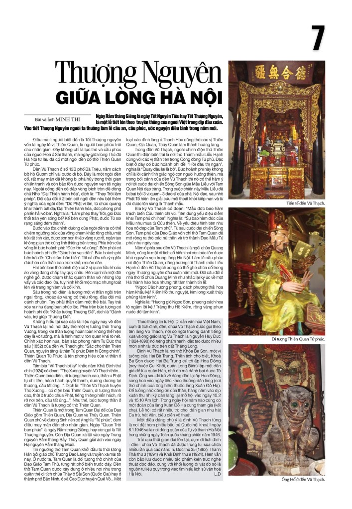 Ngày Rằm tháng Giêng là ngày Tết Nguyên Tiêu hay Tết Thượng Nguyên, là một lễ tiết lớn theo truyền thống của người Việt trong dịp đầu xuân. Vào tiết Thượng Nguyên người ta thường làm lễ cầu an, cầu phúc, ước nguyện điều lành trong năm mới. Điều mà ít người biết đến là Tết Thượng nguyên vốn là ngày lễ vị Thiên Quan, là người ban phúc trời cho nhân gian. Đây không chỉ là tục thờ và cầu phúc của người Hoa ở Sài thành, mà ngay giữa lòng thủ đô Hà Nội từ lâu đã có một ngôi đền cổ thờ Thiên Quan Tứ phúc.