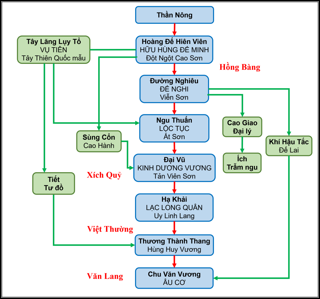 Phần đặc biệt giá trị trong cuốn sách trong lần xuất bản này là việc khảo cứu và lập nên phả đồ kết nối toàn bộ lịch sử 18 triều đại Hùng Vương, với 4 giai đoạn phát triển của xã hội Việt từ thấp đến cao. 5000 trước Đế Minh đã khởi đầu dòng họ Hùng, lập nên triều đại các Hùng Vương Sơn Thánh Tổ. Sơn triều truyền tới Kinh Dương Vương – Lạc Long Quân thì bắt đầu thời kỳ thị tộc phụ đạo, cha truyền con nối. Kinh triều trải qua các đời, tới Hùng Duệ Vương thì nhường lại vị trí thiên tử của thiên hạ cho dòng Thục Âu Cơ, bắt đầu thời kỳ phong kiến phân quyền, 1 thiên quốc và trăm chư hầu Bách Việt. Thời kỳ Thục triều này kéo dài hơn 800 năm thì được thống nhất bởi nhà Triệu, xã hội Việt bước sang chế độ phong kiến tập quyền.