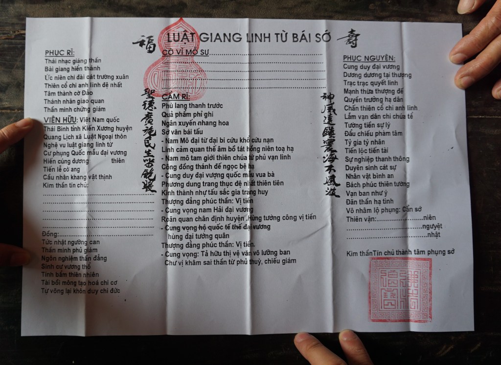 Bái sớ của đình Luật Ngoại.Một mảnh sắc phong của đền Đồng Xâm có ghi: Gia phong Triệu Vũ Hoàng Đế Nam Hải Tôn ninh.
