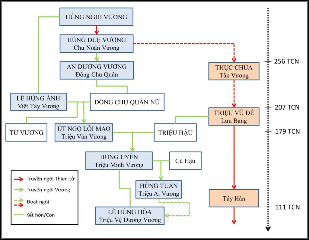 Tổng hợp thông tin từ các nguồn thần tích và di tích khác nhau có thể xác định những nhân vật và sự kiện lịch sử chính xảy ra trên đất Việt vào cuối thế kỷ III TCN – thế kỷ II TCN như sơ đồ sau.