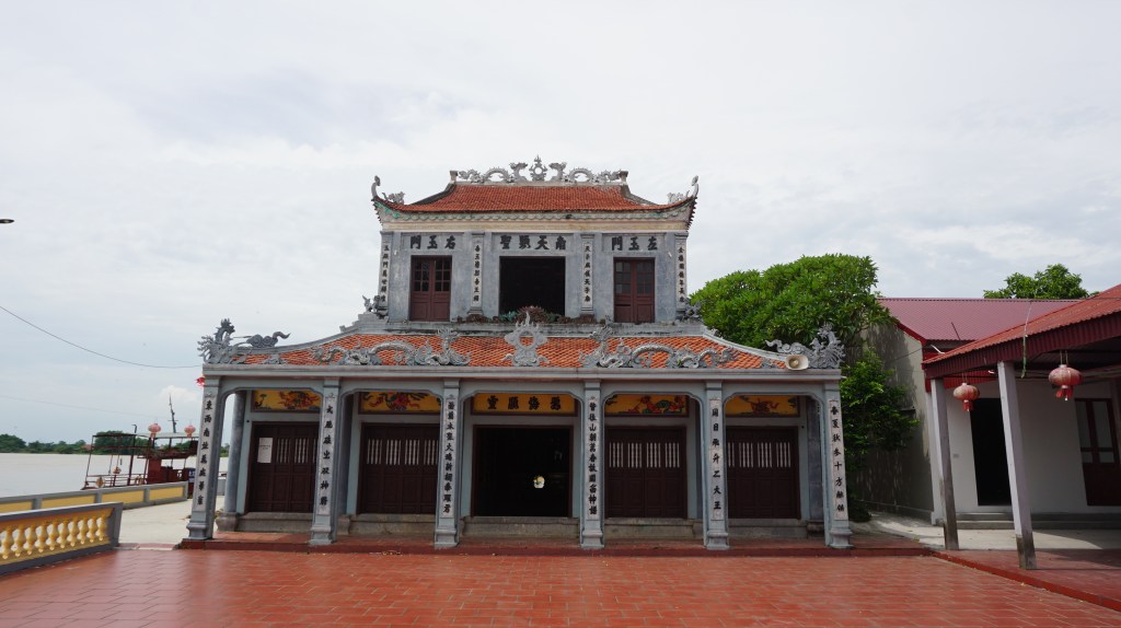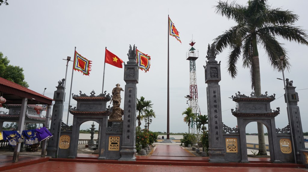 Dạ Trạch hùng bay, trăm trận núi sông còn vũ trụ Rồng xa cửa biển, muôn năm đền miếu chặn sóng đào.