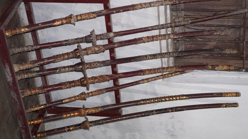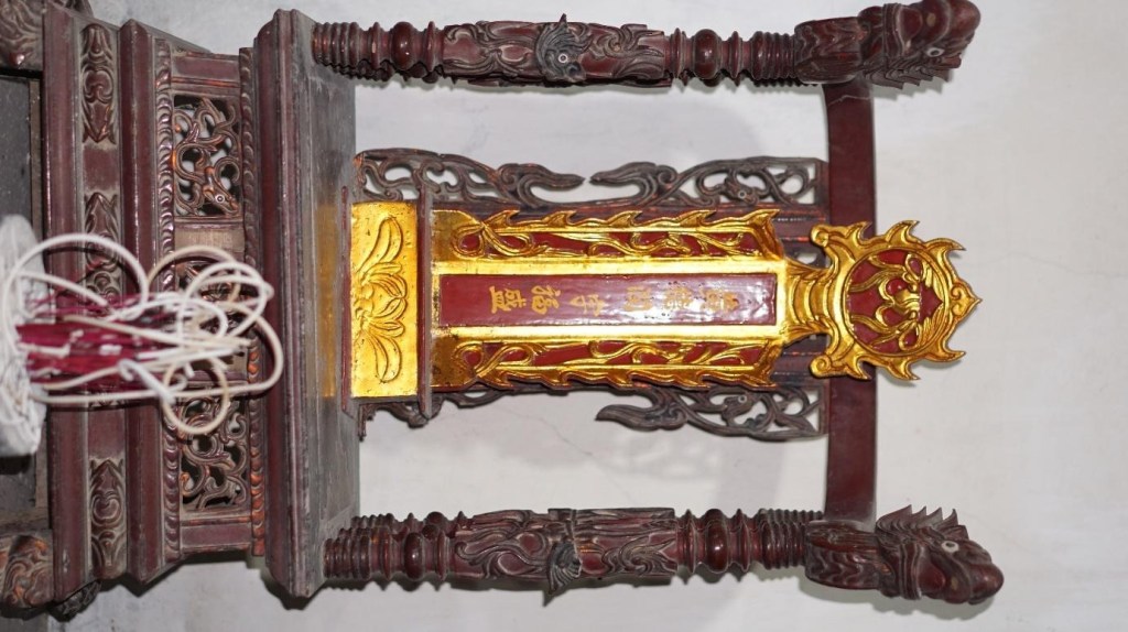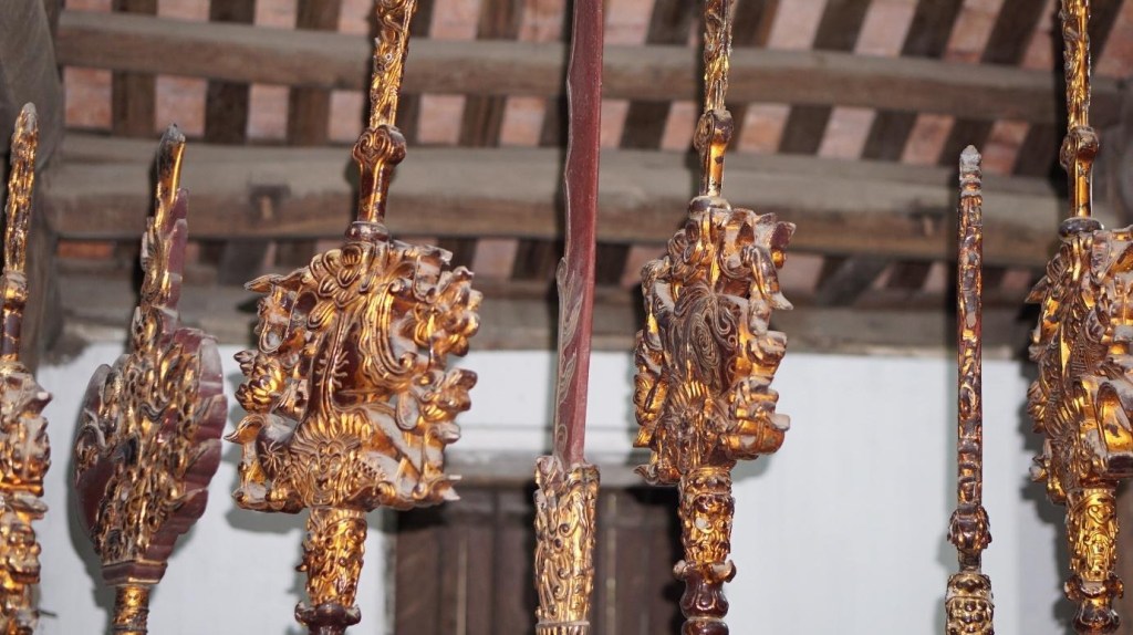 Hai bên gian tiền tế có bộ ngựa trắng, ngựa đỏ kích thước lớn, hạc chầu, cây hương đá, trống, chiêng… Đặc biệt là có 2 cỗ kiệu cổ, trong đó có một cỗ kiệu bát cống lớn sơn son thiếp vàng, chạm khắc tinh xảo rất đẹp và 1 cỗ kiệu song hành. Đồ thờ tự cổ còn có hương án, bát hương, bát bửu, chấp kích, quán tẩy, giá văn, ngai thờ, sập thờ …