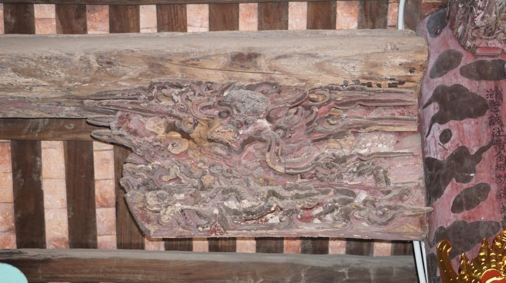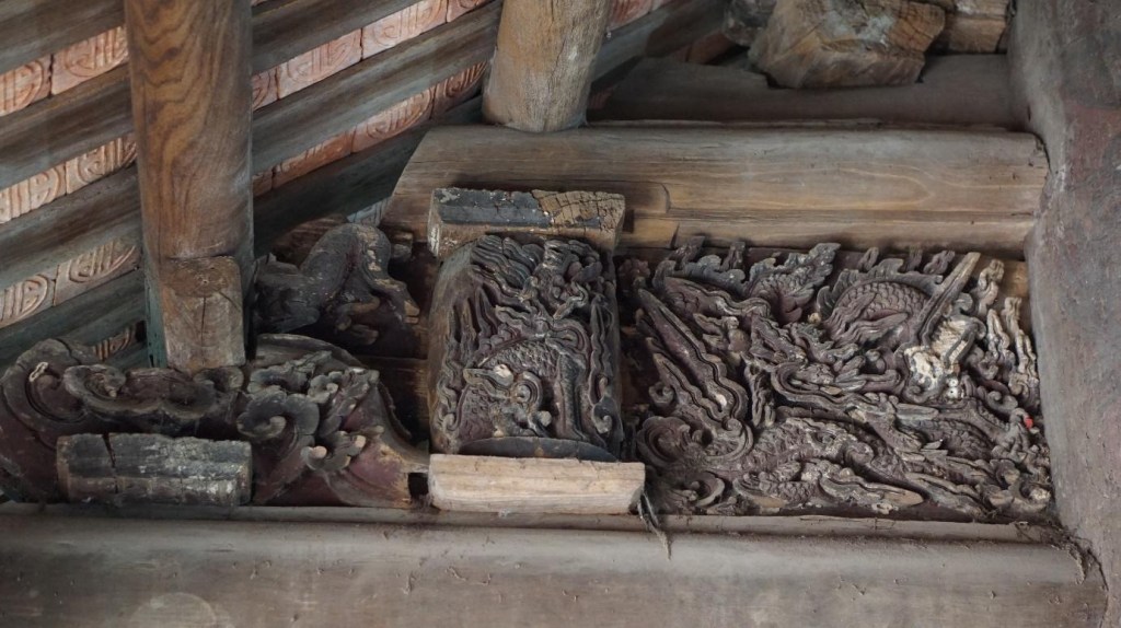 Tòa ống muống cũng chạm khắc các đề tài tương tự nhưng đa dạng hơn với các tích rồng hý thủy, cá chép, hoa sen, sóng nước… Tòa hậu cung bờ nóc đắp lưỡng long chầu nhật, bờ nóc đắp đầu kìm, nghê chầu, các đầu đao đều trang trí đề tài tứ linh, các cửa sổ trang trí gạch hoa chanh.