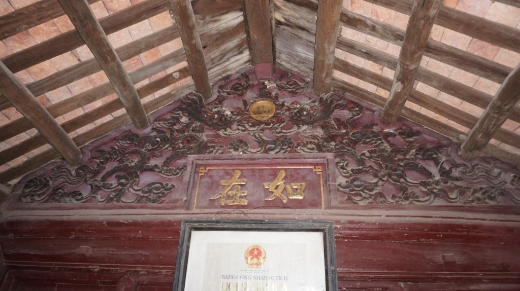 Hoành phi trước hậu cung: “Như tại” (Như vẫn còn). Câu đối hai bên cột của hậu cung: