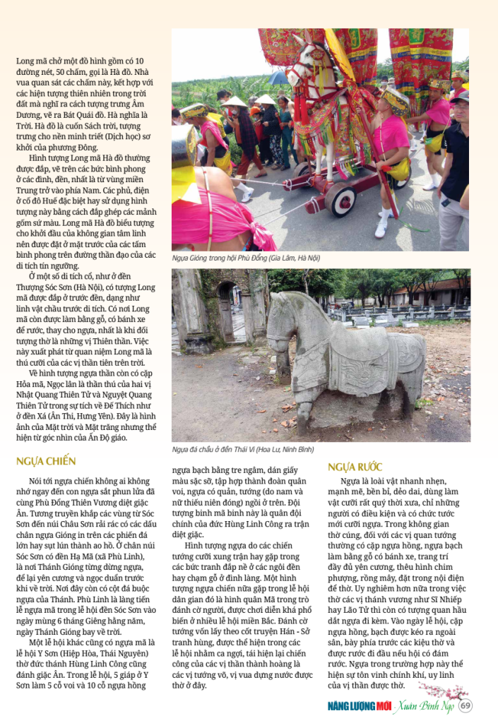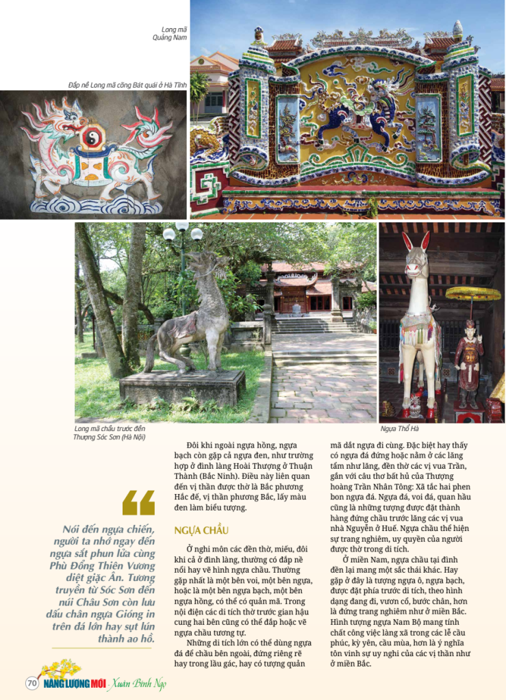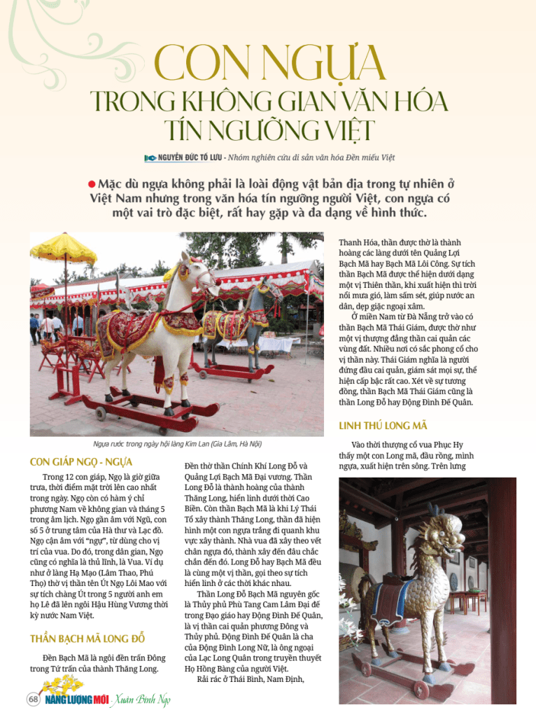 Mặc dù ngựa không phải là loài động vật bản địa trong tự nhiên ở Việt Nam nhưng trong văn hóa tín ngưỡng người Việt con ngựa có một vai trò đặc biệt, rất hay gặp và đa dạng về hình thức. Hình tượng ngựa có thể là thần Bạch Mã của kinh thành Thăng Long, thần thú Long mã, ngựa chiến của Thánh Gióng đánh giặc Ân, ngựa trong các di tích đình, đền, chùa đến ngựa trên các bức chạm gỗ, đá sinh động, ngựa trong tranh thờ của người Dao. Ngựa còn là biểu tượng của quẻ Khôn trong Kinh Dịch về sự tòng thuận, khôn ngoan đem đến sự bền vững, lâu dài cho đời sống con người.