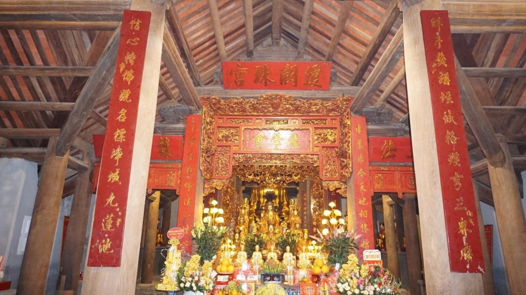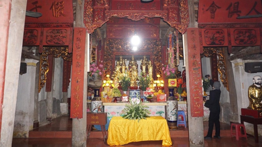 Trong nhà tổ cũng có ban thờ phật, thờ mẫu và ban thờ tổ với nhiều tượng cổ có giá trị nghệ thuật. Ở chính giữa gian nhà tổ, là nơi thờ Phật có bức cửa võng sơn son thếp vàng, chạm khắc rồng chầu, rồng phượng, tùng trúc và hoành phi: Liên trì hải hội. Nghĩa là: Hội biển ao sen. Phía trên là một bức cuốn thư sơn son thếp vàng, chạm hình hoa cúc hóa long.