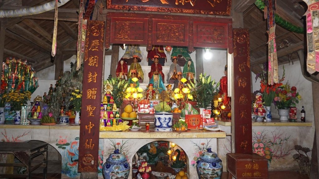 Gian thờ mẫu gồm Tam tòa Thánh mẫu và các hàng chầu, các quan hoàng… Phía trước gian có câu đối: