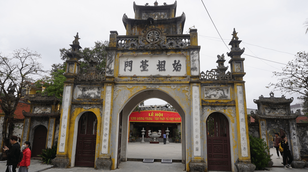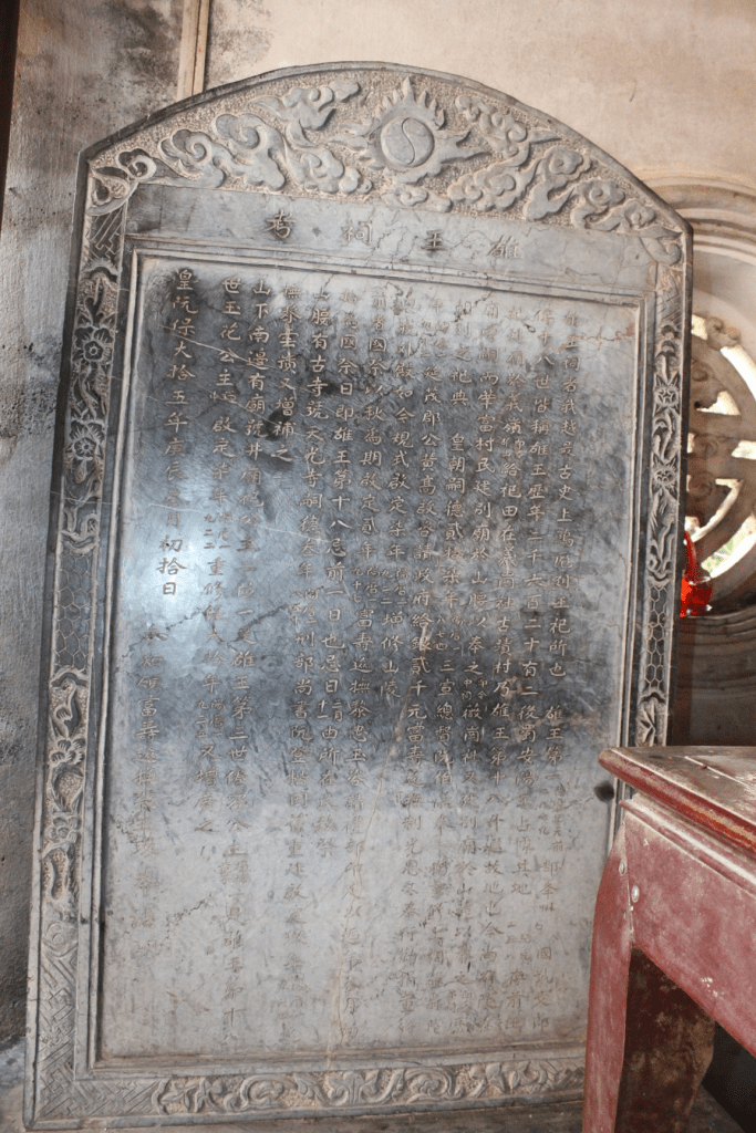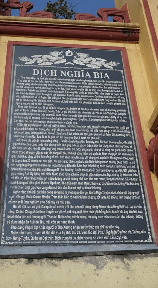 Xưa Hùng Vương Sơn nguyên Thánh Tổ Nam Thiên Đại bảo Tiền Hoàng đế khai mở cơ đồ, thủy tổ trời Nam, nước Cổ Việt họ Hùng Việt Thường, 18 đời thánh vương ngự trị trời Nam, sáng lập cơ đồ nước Việt. Nước biếc một dòng mở vận đế thánh vua sáng. Núi xanh vạn dặm lập nền cung điện đô thành. Mở vật giúp người, thống lĩnh 15 bộ, thế mạnh trùm khắp phiên bang. Nối tiếp ngôi báu đất Viêm Hồng, có vua trị nước hơn ba ngàn năm, mãi giữ cho tông miếu vững như bàn đá. Hiển ứng linh thiêng nơi Nghĩa Lĩnh, truyền trăm đời đế vương nước Nam. Đế ngự muôn năm thánh điện núi Hùng, đất tổ trời Nam. Nền vua đất nước mãi vững muôn năm, mãi còn vạn cổ. Hương lửa không dứt.