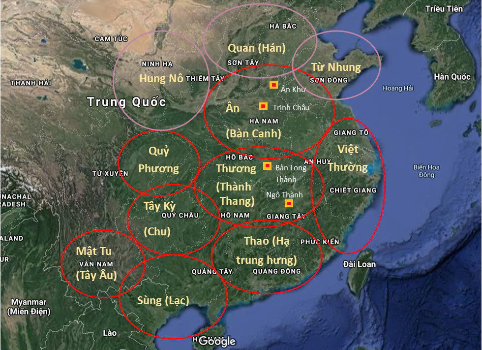 Trong truyền thuyết Việt có dòng theo cha Lạc Long Quân xuống khai phá vùng đồng bằng ven biển ở phía Đông. Ban đầu đó là nhà Hạ Trung Hoa. Nhà Thương nối tiếp nhà Hạ, vẫn lấy Rồng làm biểu tượng, nhưng lại gọi là Long Khuyển. Khuyển hay Khang là tính chất của hướng Tây. Cẩu (chó) cũng là cửu, chỉ hướng Tây. Long Khuyển nghĩa là tộc người dòng Rồng ở phía Tây, bởi phần hướng Đông là nhà Hạ.
