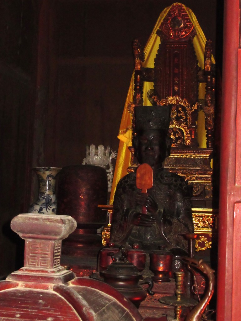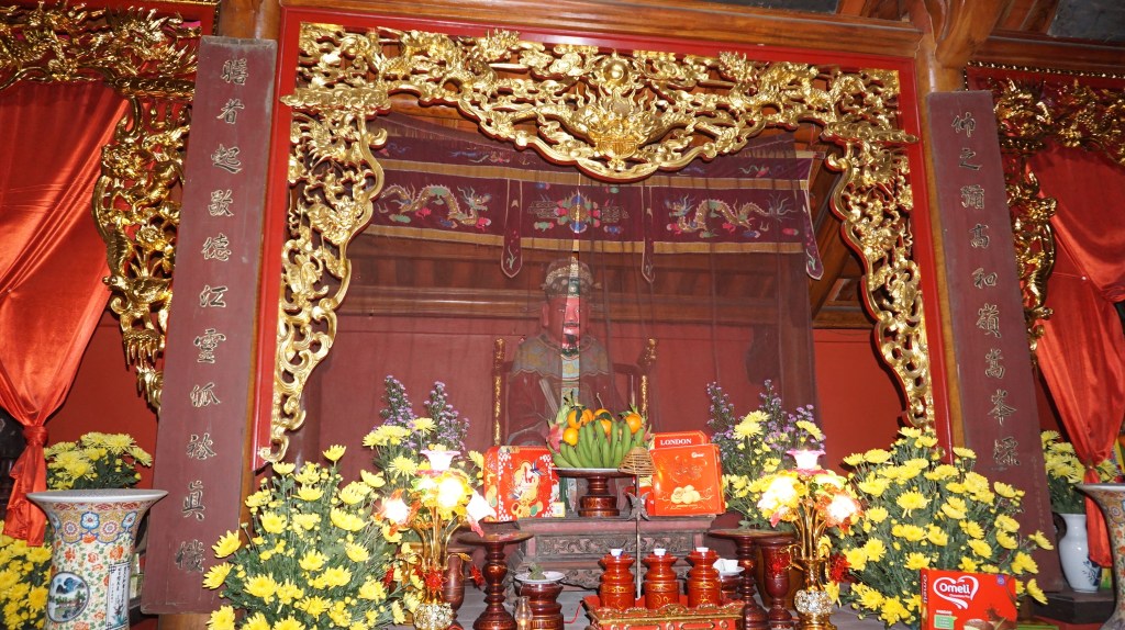 Bên phải của hậu cung là ban thờ ghi chữ “Triết” bằng sành ghép. Phía trên có treo bức hoành phi sơn đen, thiếp vàng lớn đề: Quán bách vương. Nghĩa là: Cầm đầu trăm vua.
