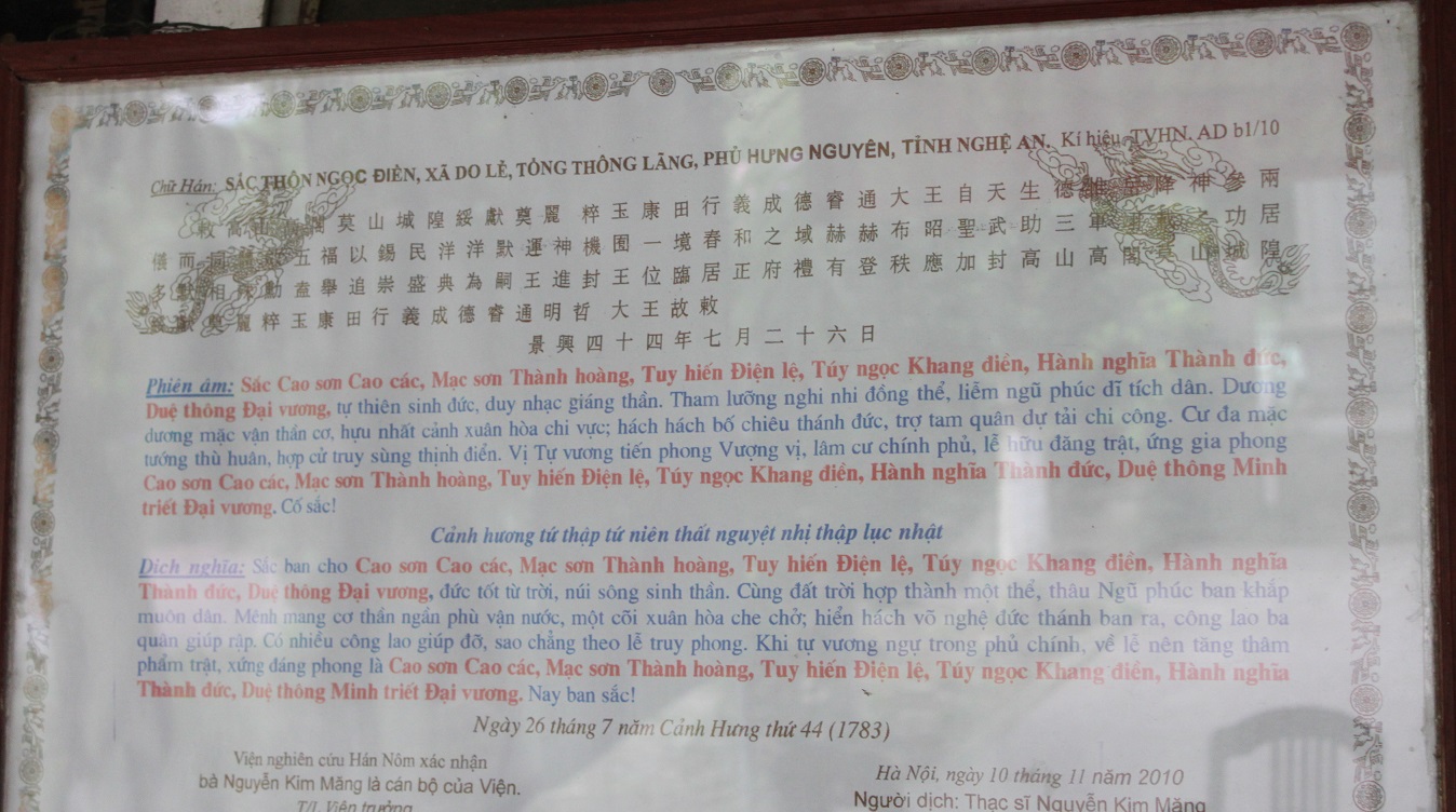 Một sắc phong ở đình Phú Gia: Khai Nguyên Địch giáo Long ân trứ Uy hiển Trung vũ…